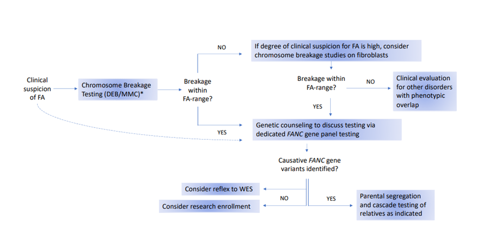 • “The recommended testing procedures are outlined in the flow chart in Figure 1. The flow chart presents one potential algorithm for testing, starting with chromosome breakage testing and ending with genotyping. However, genetic testing has become increasingly utilized as a first-line diagnostic test, especially for newborns and pediatric patients with multiple congenital anomalies. Regardless of the order of testing, it is important that both chromosome breakage and germline genetic testing be performed to obtain a precise diagnosis in all persons with suspected FA.”