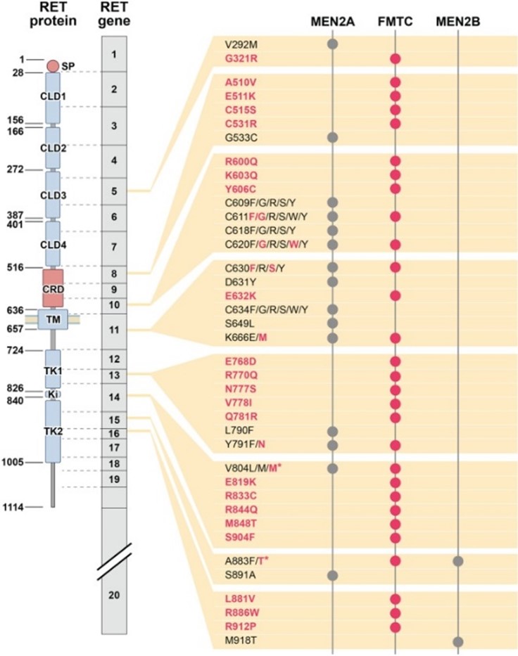 31. Frank-Raue K, Rondot S, Raue F. Molecular genetics and phenomics of RET mutations: Impact on prognosis of MTC. Mol Cell Endocrinol. Jun 30 2010;322(1-2):2-7. doi:10.1016/j.mce.2010.01.012